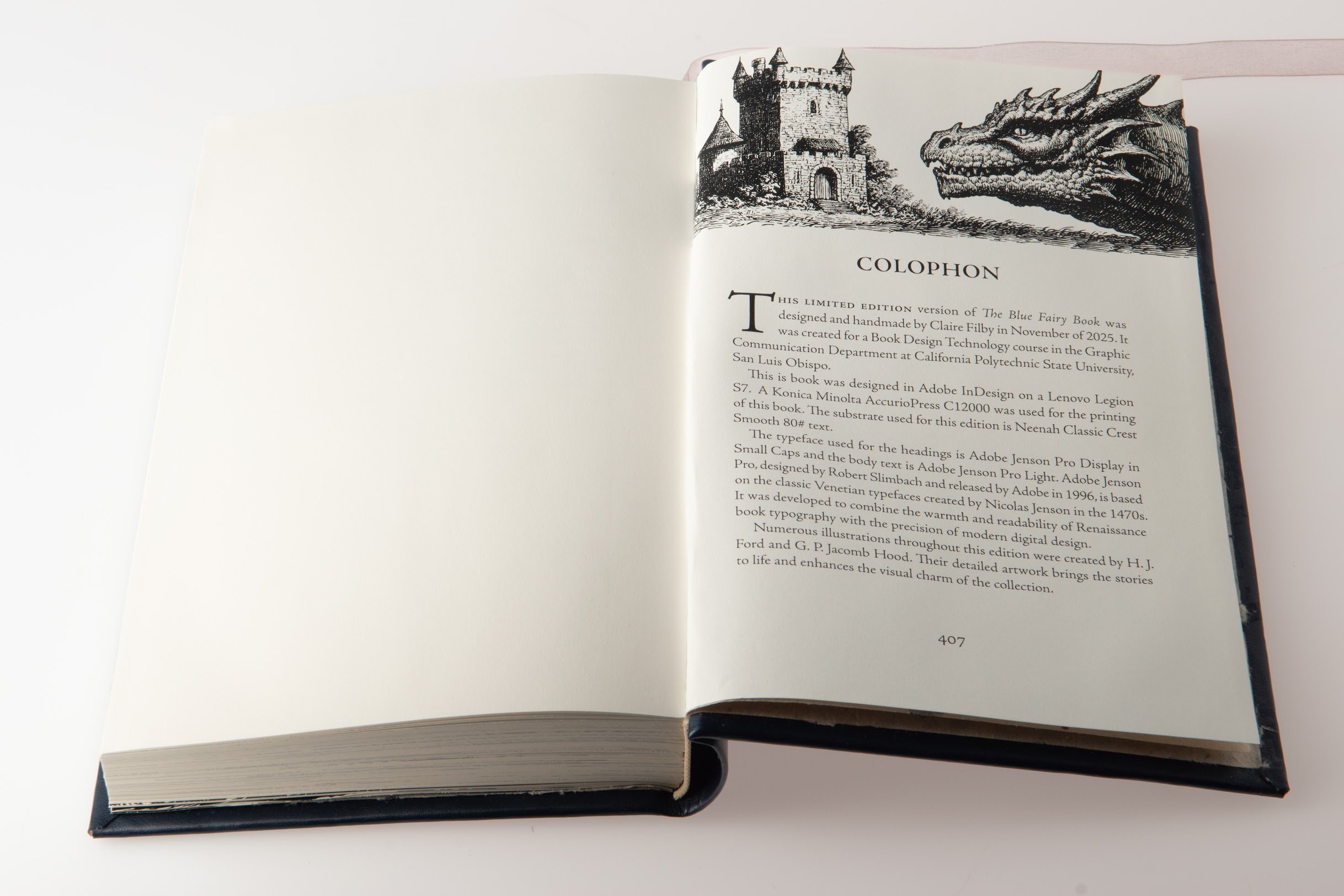 I designed this limited edition book with the intention of creating a reading experience that feels timeless and whimsical. For the typeface, I selected Adobe Jensen Pro because its small caps variation adds a bold, fantastical quality, while the slightly quirky serif details give the body text a distinctive character that supports the tone of the story. I wanted the typography to feel both classic and imaginative, something that invites the reader into the world of the book the moment they begin reading.