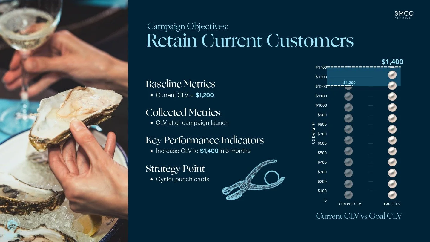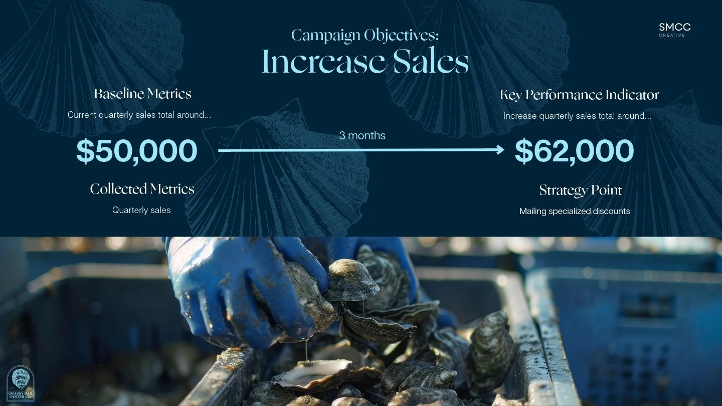 The key slides in this project walk through the full marketing process for Grassy Bar Oyster Company, beginning with our four primary goals that guided every design and strategy decision. They outline the personas we developed to understand the eco-conscious diner, casual diner, and wholesale buyer, showing how each audience segment shaped our messaging. The slides also highlight the data collection and audience insights that made it possible to build customized direct-mail and digital campaigns, including variable data postcards and targeted outreach across platforms.